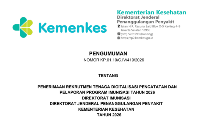 PENGUMUMAN TENTANG PENERIMAAN REKRUTMEN TENAGA DIGITALISASI PENCATATAN DAN PELAPORAN PROGRAM IMUNISASI TAHUN 2026